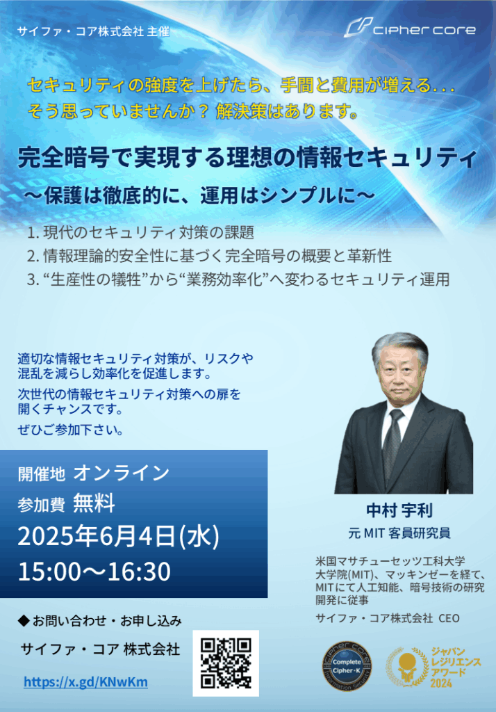 MITの客員研究員として、最先端の人工知能と暗号技術の研究開発に従事し、「完全暗号」技術を完成させ、理論と実践の両面から情報セキュリティの課題に取り組んできた中村宇利代表から、その内容を聴講するオンラインセミナーを開催します。